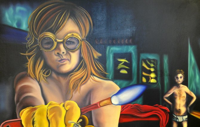 Heidi Pitre's work may be the boldest of the bunch. A 2012 "Best in Show" winner at the Cedars art show, Pitre's paintings expose the power and vulnerability of the nude female form. Frequently, her pieces feature a woman holding a paintbrush as a blowtorch, but occasionally her subject is dangling from a cliff or kneeling on a net with a piece of cake.