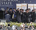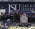 First lady Michelle Obama acknowledges a graduating student in the crowd as Dr. Carolyn Meyers introduces her. (L-R)